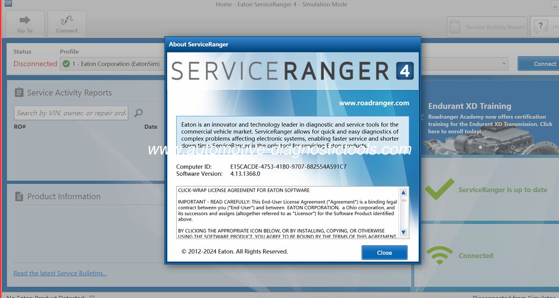 Ranger de service Eaton 4.13 Marque: EATON Mise à jour: 2025 Version: V4.13 Catégorie: camions et camions lourds Taille du fichier: 1,2 Go Type de logiciel: Diagnostique Région: TOUTES les Régions Système d'exploitation: Windows 10/11 (64 BITS) Langue de la base de données: anglais Langue d'interface:Anglais, français, espagnol 1.Eaton Service Ranger 4.13 est un outil de diagnostic et de service pour les transmissions automatisées Eaton. 2Il offre des fonctionnalités telles que la lecture de codes d'erreur, la surveillance des données, le rapport sur l'activité de service et l'étalonnage de l'embrayage, ainsi que la possibilité de mettre à jour le logiciel et de modifier les paramètres de configuration. 3Une nouvelle fonctionnalité clé de la version 4.13 est l'Assistant de connexion, conçu pour simplifier le processus de connexion aux TECU et TCM d'un véhicule.